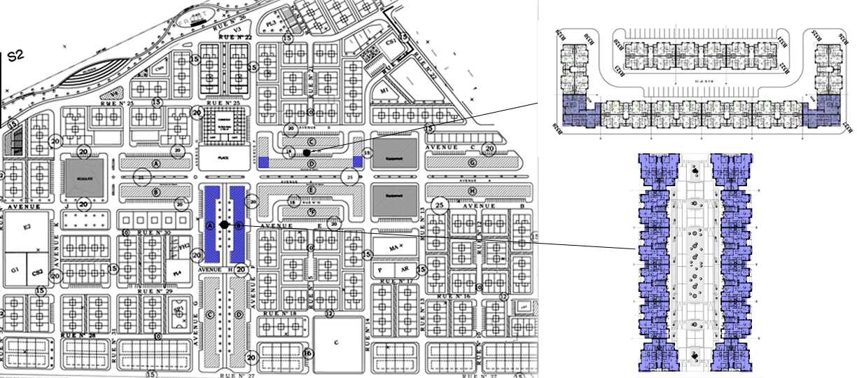 Immeubles localisés à moins de 200m de la côte maritime, 300m de la forêt urbaine Hypica et au centre d’un lotissement en plein développement socio-économique. Divers équipements de proximité sont prévus au profit des résidents: Equipements sportifs, socio-culturels, d’enseignement, de santé, commerces, mosquées, fours hammams, places publiques…